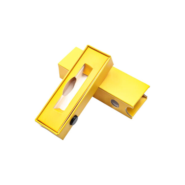 This 8×3×1.5 cm cardboard drawer box features a compliant child-resistant button and custom paper insert shaped for cannabis pods. Designed for safety and compliance, it keeps children protected while securing products. Fully customizable in size, style, and printing to match your brand.