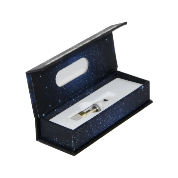 Esta caixa de oferta rígida inclui um fecho magnético, um suporte de espuma EVA e uma janela transparente. Este tipo de design é o mais popular nas embalagens de cartuchos Vape. O material da caixa é papel rígido de 1200 GSM e papel artístico de 157 GSM. Esses materiais podem garantir que a caixa seja muito forte para transporte e armazenamento. A espuma EVA foi moldada pelo cartucho vape, que é 100% adequado para embalar o produto. A janela transparente na parte superior da caixa permite visualizar bem o cartucho de vapor. Imprimimos os textos e padrões por impressão offset, a proteção da superfície é laminação mate. Podemos personalizar todos os pormenores de acordo com os pedidos dos nossos clientes.